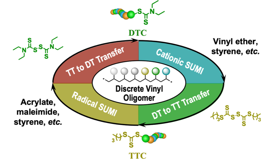 单倍单体插入(SUMI)策略是制备序列定义乙烯基聚合物合成的最重要方法,它能通过自由基或者阳离子机制进行。阳离子机制的SUMI反应由我们课题组首次报道(J. Am. Chem. Soc. 2023, 145, 3636)。众所周知,许多应用场景需要同时包括自由基和阳离子可聚合单体。课题组最近报道了正交的阳离子与自由基SUMI,使二者能够在一锅中相互独立的进行(Angew. Chem. Int. Ed. 2024, 63, 202402265)。同时,为了使阳离子和自由基可聚合单体能够序列可控的排列在一条链上,机制转换变得势在必行。然而,调控阳离子SUMI需要二硫代氨基甲酸酯链转移剂、而自由基SUMI最优选择是三硫代碳酸酯。因此,实现两种SUMI反应相互转化的必要前提是RAFT硫酯端基的相互切换。在本项工作中,我们利用三硫代碳酸酯(TTC)与双(硫代羰基)二硫化物在自由基机制下的选择性交换反应,完成从TTC到二硫代氨基甲酸酯(DTC)的定向转化。反向过程则利用DTC与双(三硫代碳酸酯)二硫化物在阳离子机制下的选择性交换反应来实现。