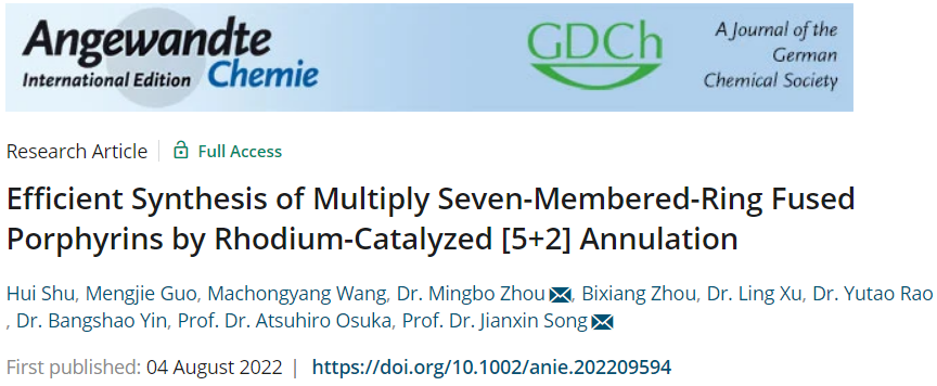 近日,yl6809永利官网宋建新教授团队周明波研究小组在卟啉类功能分子的设计、合成与性能研究方面再度取得重要进展,并在国际化学顶级期刊《德国应用化学》发表题为“Efficient Synthesis of Multiply Seven-Membered-Ring Fused Porphyrins by Rhodium-Catalyzed [5+2] Annulation”的学术论文(Angew. Chem. Int. Ed.2022,61,e202209594)。该论文获得了评审人的高度评价,并被推为HotPaper。
