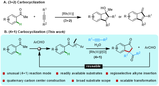 他们最近的研究发现,在三价铑催化条件下,查尔酮和内炔能分别作为苯乙酮和C1片段的前体使用,实现3,3-二取代1-茚酮的便捷合成,同时释放出可被重复利用的芳香醛。查尔酮β-位的芳基、催化剂的CP配体以及底物炔碳上取代基的大小能极大地影响反应的产率和选择性。该反应可在克级规模下进行、具有较好的底物普适性和官能团兼容性,能应用于复杂结构的后期转化。从整体上看,通过两步反应策略,即羟醛缩合查尔酮合成反应和三价铑催化的(4+1)碳环化反应,能完全改变芳基乙酮与内炔的环化反应模式。