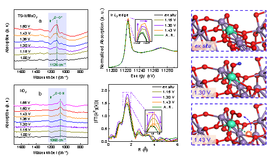 本研究通过水热-快速热解策略Ir单原子锚定的MnO2(TS-Ir/MnO2)催化剂晶格中引入拉伸应力调整表面Ir位点的吸附行为,加速*OH在表面氧空位处的去质子化,从而有效防止Ir位点的局部过氧化,减少溶解,保持催化剂的结构完整性。利用多种原位谱学表征(原位XAFS和FTIR)结果,成功揭示单原子铱电催化剂具有高效酸性OER活性的催化本质,提出了反应中水分子可以快速填充氧空位而抑制体相材料的溶解的局域晶格氧介导机理(L-LOM),该工作突出了优化新型材料电子结构的重要性,并加深了对单原子催化剂在促进OER性能方面结构动态演变反应机制的理解。