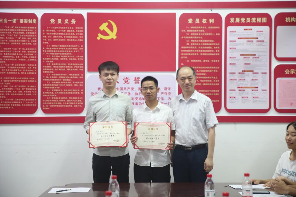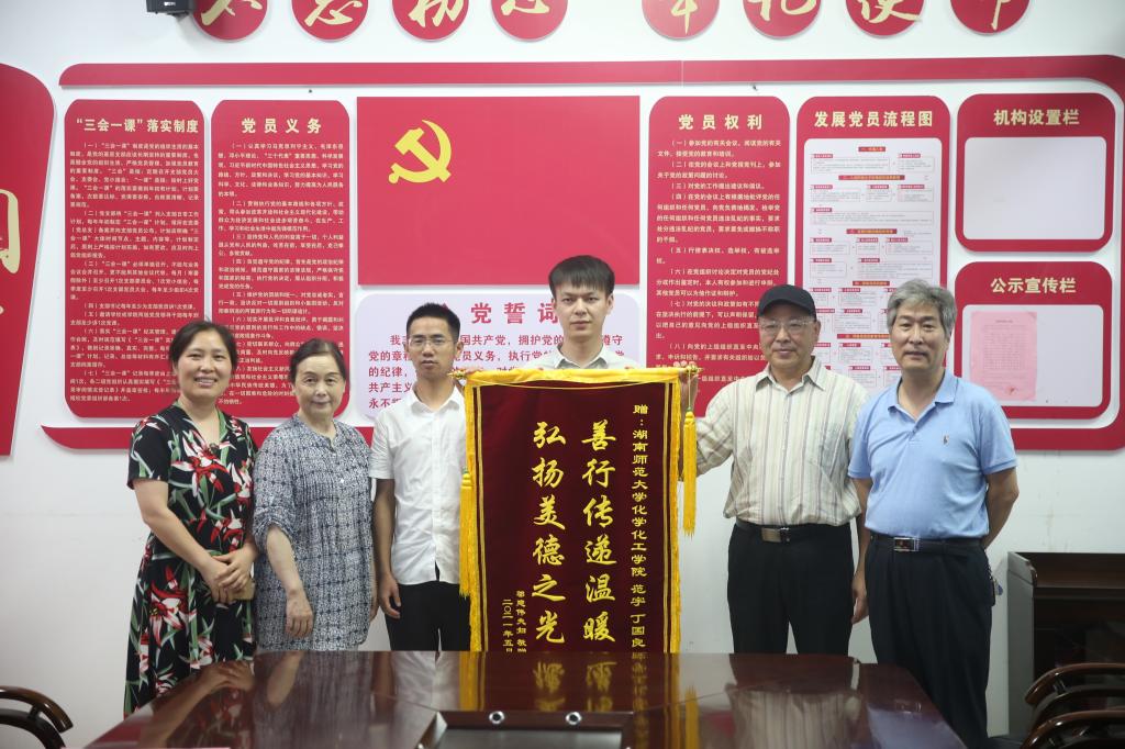 欧阳唯一向大家介绍了两件好人好事,分别是于风江在地铁上救助晕倒路人并将其送往医院救治和范宇、丁国良在岳王亭帮忙搜救受伤老人,展现了化工师生的责任与担当。活动现场,邬建伟夫妇向范宇、丁国良赠送锦旗,对他们助人为乐的义举表示深深的感谢。邬建伟夫妇肯定了湖南师范大学良好的校风以及“仁爱精勤”的校训,并指出了祖国的未来需要范宇、丁国良这样有奉献精神的人才。同时,杨震为两位同学颁发证书,肯定了两位同学勇于践行青年使命的精神,呼吁大家铭记建党初心。随后,于风江、范宇、丁国良作为优秀代表发言。于风江希望大家可以不忘初心,牢记使命,成为祖国的栋梁。范宇、丁国良向大家强调了不忘初心,牢记青年身上使命与担当的重要性。