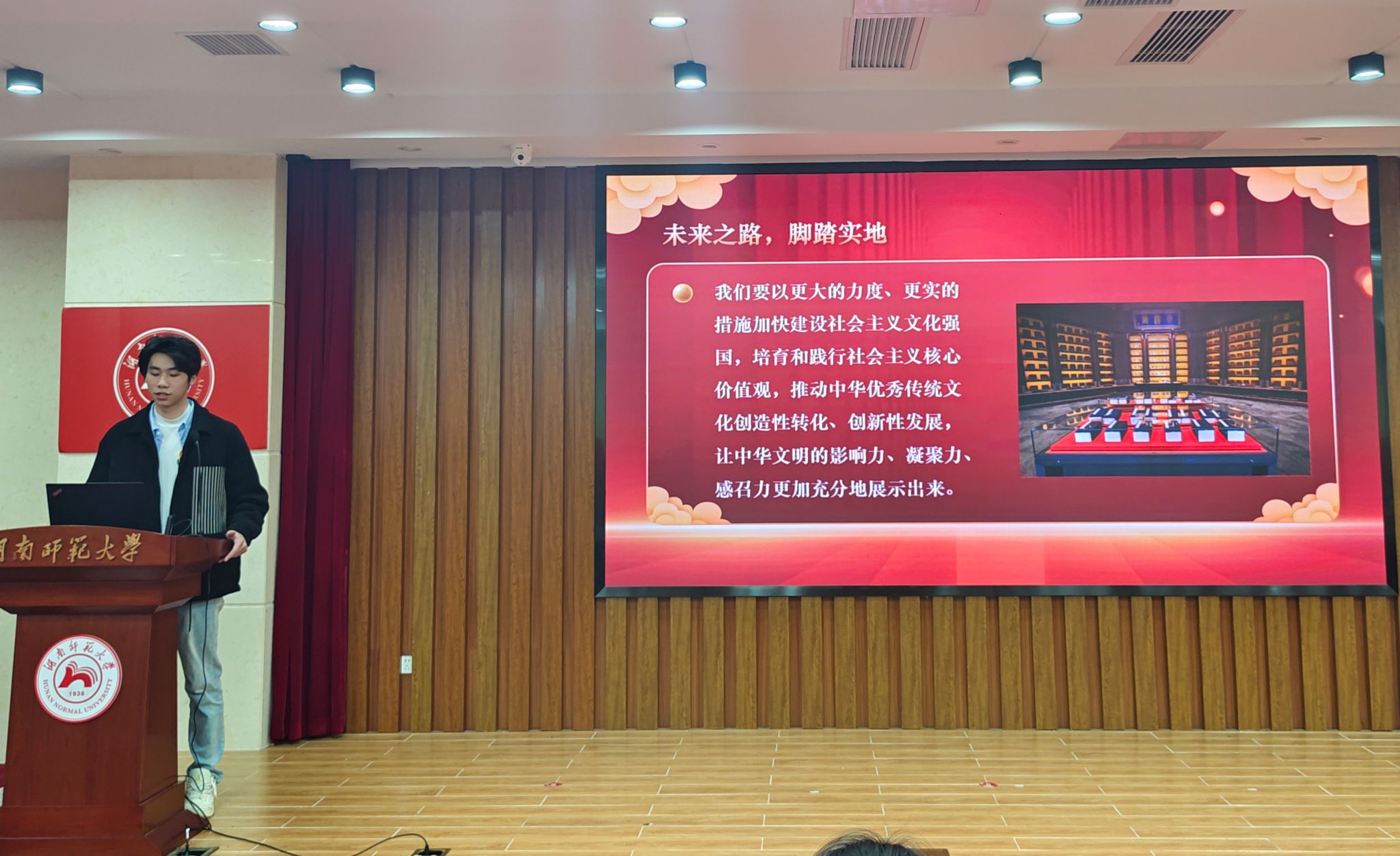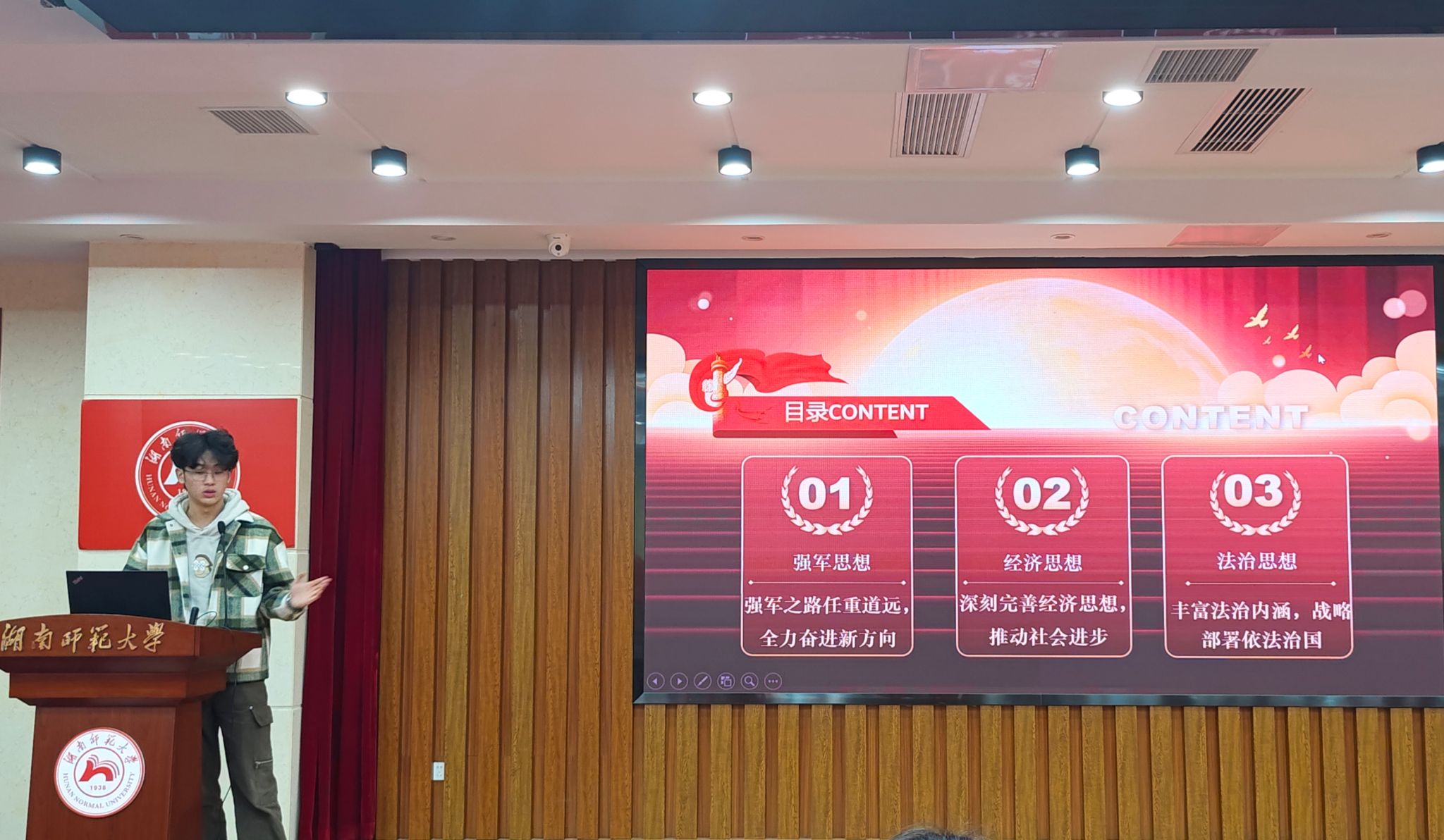 谭进杰讲述习近平外交、文化和生态文明思想。谭进杰着重强调了思想要领和实践工作的重要性。他指出,政策思想是国家发展的指南针,作为湖南师范大学的学生,应当关注两会,了解国家政策,以便更好地将所学知识与国家发展相结合。