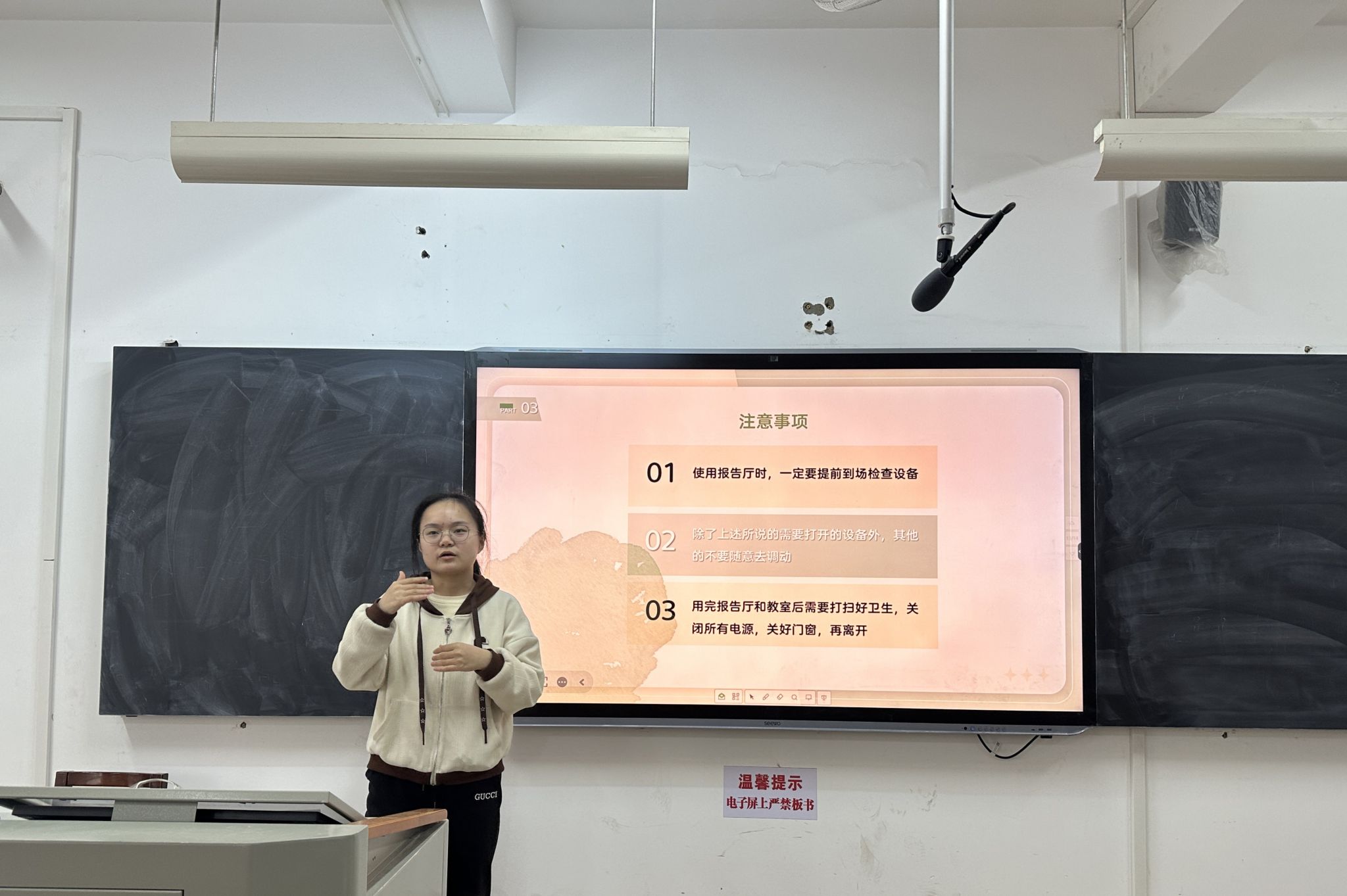 在各部门开展工作汇报之前,办公室第一负责人刘雅凯上台进行办公室技能培训,内容是讲解借用教室的流程。此次培训采取PPT分享的形式,刘雅凯着重向参会人员介绍了化学楼教室的借用流程,并结合长时间以来的工作经验提出了一些容易被忽视的细节。