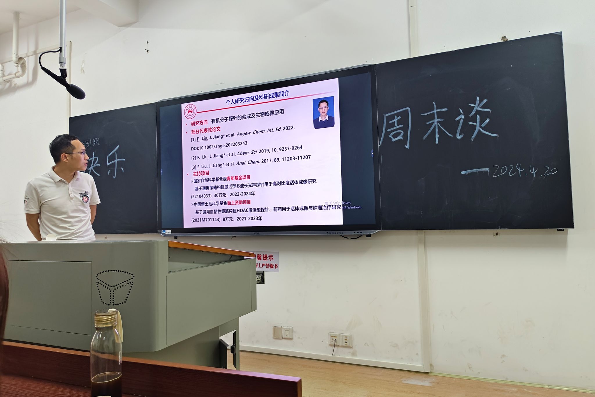 (通讯员 刘诗晗)4月20日上午9时,yl6809永利官网学生会办公室在化工院217教室开展了第331期快乐周末谈。此次快乐周末谈的特邀嘉宾为化工院副教授刘锋,他借此次活动向同学们讲解他的研究方向:化学生物学——有机分子探针技术,希望能以此激发同学们对科研的兴趣,能够选择将自己的未来投入到科研中去。