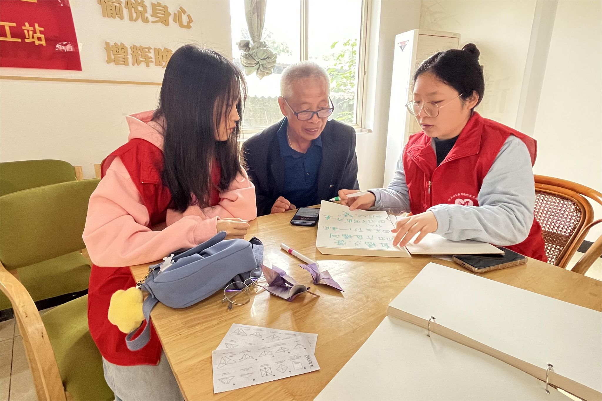 活动开始时,志愿者们带着老人进行了折纸活动,折出了美丽的蝴蝶,拉近了志愿者与老人之间的距离。在折纸后的欢声笑语中,老人向志愿者们提出了自己在日常生活中使用手机时遇到的问题以及想要学习的内容,志愿者们也积极地为老人解决问题,耐心地向他们演示使用手机的步骤并用纸笔记录下来以便之后的复习。负责人还开展了养老防诈的宣讲,提醒老人在使用智能手机时也要预防诈骗。