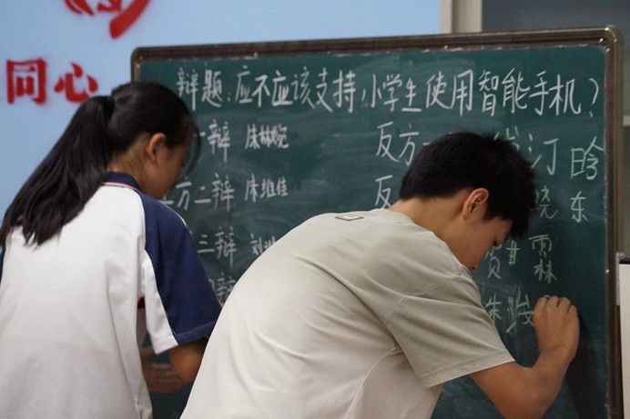 赛前学生书写双方辩手姓名