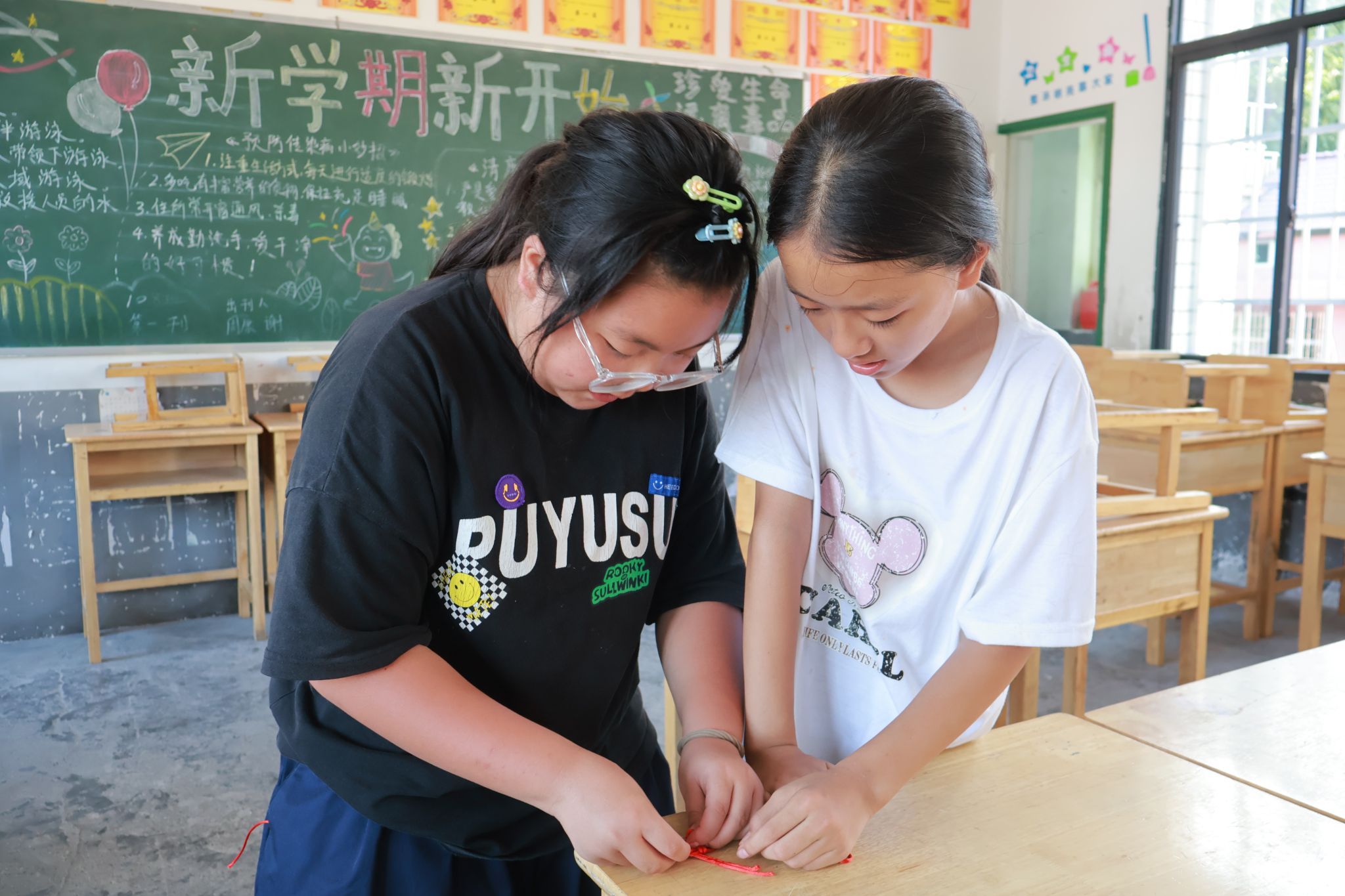 在理论学习环节,老师向学生们介绍了中国结的历史和寓意,让学生们进一步了解中华优秀传统文化。在学生动手实践的过程中,由于中国结的编织难度较大,许多同学都遇到了困难,对此,老师对同学们进行了一对一指导,同时,学生之间也相互沟通和帮助,共同解决问题。课程末,老师邀请学生上台展示,与同学们共同欣赏学生亲手制作的作品。