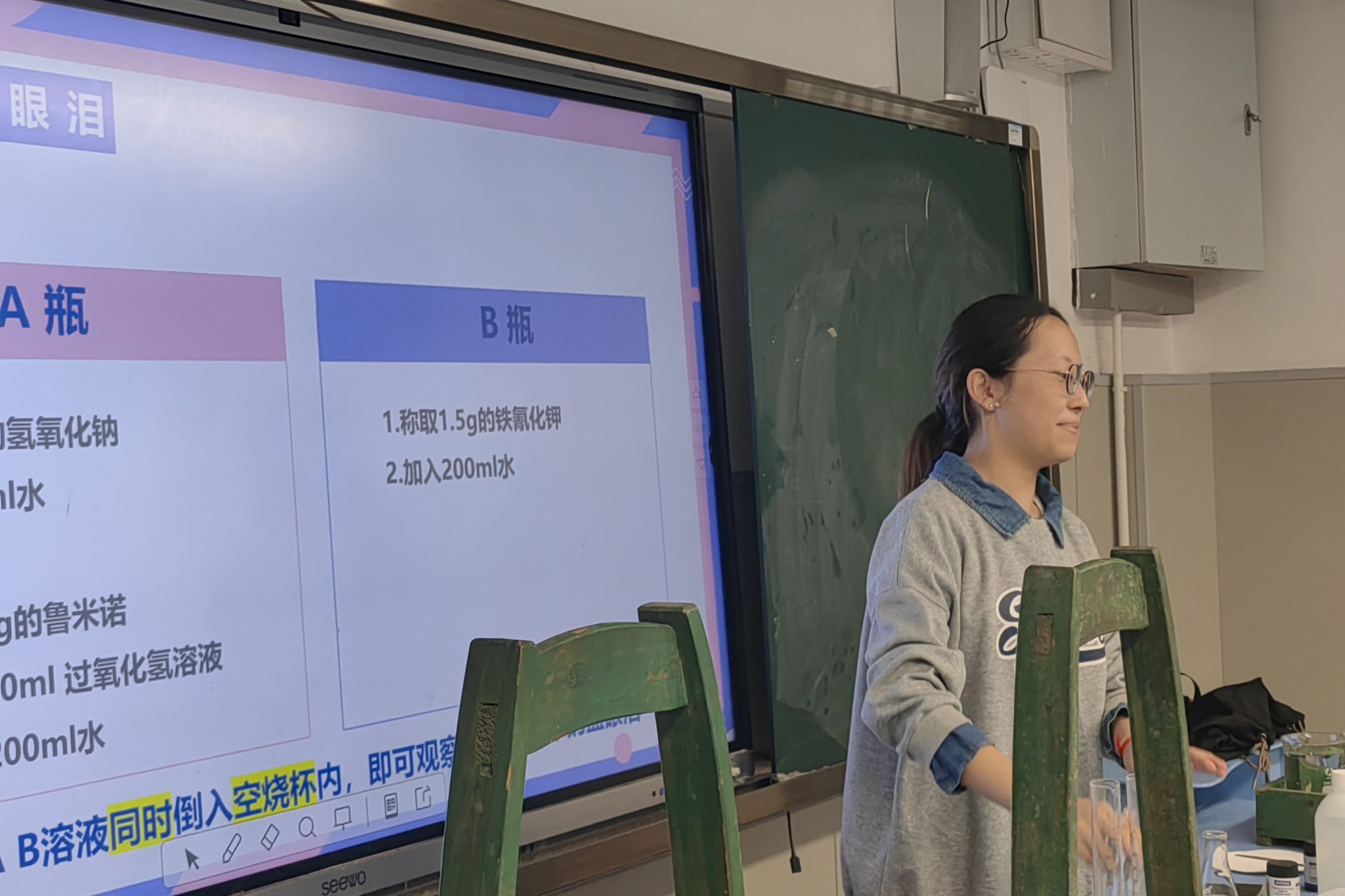 在此次课程中,王若晴从自然界中“蓝眼泪”现象引入,进而引出化学版“蓝眼泪”鲁米诺荧光实验这一主题。在鲁米诺荧光实验开始前,王若晴详细讲解实验步骤及安全规范。在志愿者的协助下,同学们通过一系列操作过程,观察到了鲁米诺在碱性环境中与过氧化氢反应发光的实验现象,从而完成了化学版“蓝眼泪”实验。活动过程中,志愿者们带领同学们积极思考、主动探索,为同学们答疑解惑,引导同学们交流互动,提高同学们的积极性。