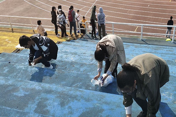 活动开始前,志愿者们在田径场楼梯口集合,负责人安排好相关事宜后带领志愿者们开始活动;志愿者们进入观众区,收集化工院观众区的塑料瓶等废品,而后以小组的形式进行活动,收集了周围空地上遗留的垃圾。志愿者们将垃圾统一放到一个大垃圾袋中,进行统一处理。