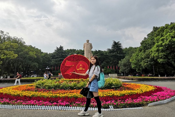 此次团日活动由团支部书记杨欣怡组织策划,活动方式以“线下打卡庆祝地点”为主。1808团支部全体同学以寝室为单位,分别前往校碑、校门、岳麓山脚与祖国进行合影,庆祝中华人民共和国成立70周年。