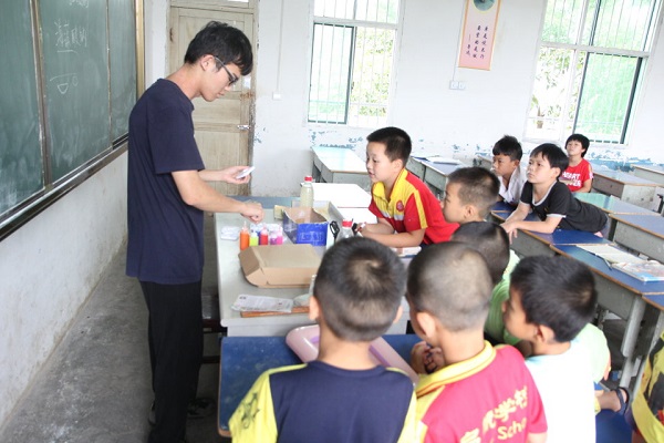7月15日下午14时30分,yl6809永利官网学生社团联合会赴祁东暑期社会实践团开展趣味实验课程,由化学老师苏文韬带领孩子们做实验。