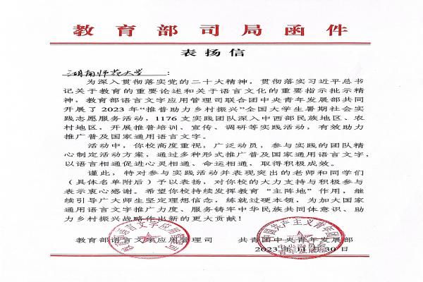(通讯员 胡筱晨)近日,教育部语言文字应用管理司、共青团中央青年发展部发来表扬信,对我校积极开展2023年“推普助力乡村振兴”全国大学生暑期社会实践志愿服务活动给予了表扬,对我校实践团队积极推广普及国家通用语言文字、助力乡村振兴给予了高度肯定。其中yl6809永利官网“麓山青年”暑期社会实践队获2023年“推普助力乡村振兴”全国大学生暑期社会实践志愿服务活动优秀团队。