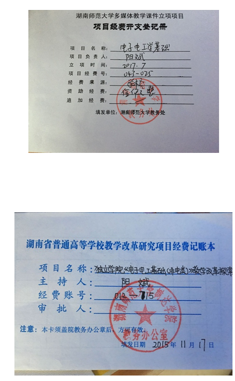 我们团队的阳斌老师和夏悦老师在本年度取得如下一些教学或教研成果:阳斌老师荣获2017年湖南省普通高校教师课堂教学竞赛三等奖,阳斌老师的电子电工学基础获批湖南师范大学多媒体教学课件立项项目,阳斌老师主持在研的“独立学院《电子电工基础(非电类)》教学改革探索项目”是湖南省普通高等学校教学改革项目(2015-2018年);阳斌老师的《电子电工基础(少学时)》教学改革及在线课程的开发为2017年湖南师范大学教学改革研究立项项目(经费本暂未拿到)。夏悦老师的“自绘思维导图构建化学热力学知识体系”参加了湖南师范大学2017年教学工作创新案例竞赛。