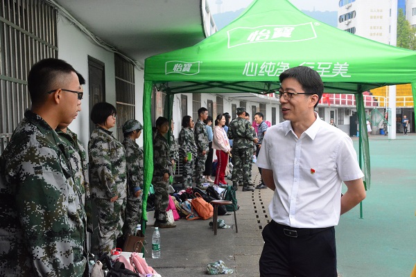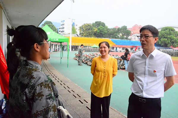 于风江引用历史事件向同学们强调国防工作的重要性,告诫同学们认真对待军训任务。同时他仔细询问了伤病同学的具体情况,并对少数民族同学进行了关切慰问。他指出,恰逢中华人民共和国成立七十周年,同学们当以扎实的基础知识、强健的体魄,为祖国做贡献。