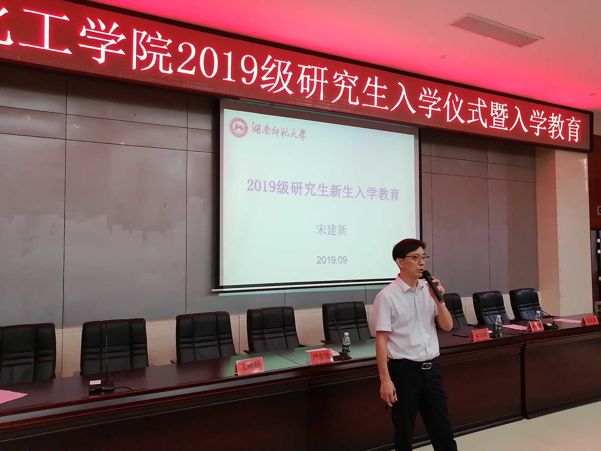 2019年9月11日下午15:00,我院2019级研究生新生入学典礼暨新生入学教育在我院新楼二楼报告厅召开。出席此次会议的有:化学化工学院党委书记于风江、副院长宋建新、副院长谭东波、党委副书记耿自强、常务副主任毛丽秋、研究生导师代表倪新龙,以及2019级全体新生。会议由副院长宋建新教授主持。