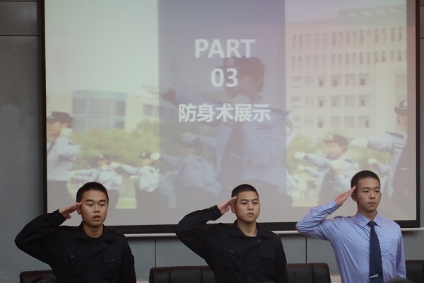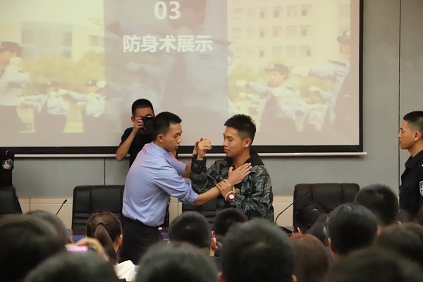 邹诗月同学以过量饮酒导致暴力和性侵的真实案例作出直观的警醒,并向我校同学普及关于酗酒闹事、酗酒行凶导致的法律后果。警校实践团成员通过简单实用的防身术教学,吸引在场同学参与互动和学习兴趣,进一步牢固同学们安全防范能力。