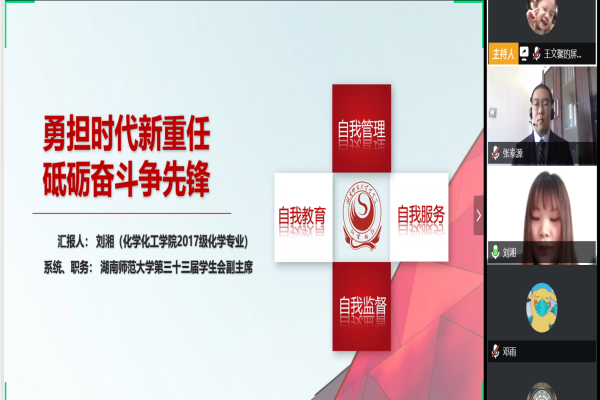 (通讯员 邹彪 张泰源)受疫情影响,4月25日9:30,yl6809永利官网通过网络会议召开2019-2020学年度团学组织述职大会。化工院党委副书记罗艳老师、院团委书记屈杜炜老师、学工办辅导员熊慈老师、付玉丽老师、杨魏鹏老师出席大会。会议由团委发展部张泰源主持。