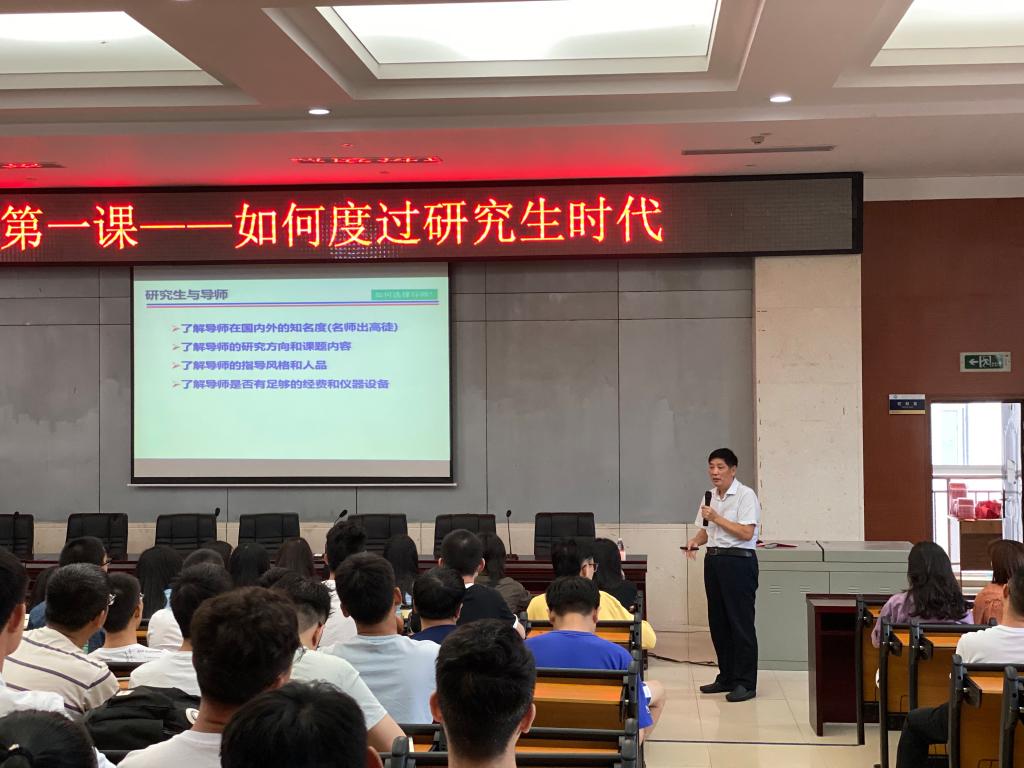 杨荣华向新生表达了诚挚的欢迎和祝贺,他希望同学们把自身发展与国家前途、民族命运紧密联系在一起。他从多个角度分析讲解了研究生阶段学习、工作、生活的特点,着重传授了文献查阅、研究选题、实验设计与落实、论文写作等方面的方法,并就如何提升科研能力与成果表达能力等提出了建议。他指出,做人第一、为学第二,主动学习,诚信科研。他希望同学们能够享受工作、享受生活、享受科研,心怀梦想,不惧挑战,勇攀学术高峰,为人类进步、社会发展作出更大更多的贡献。