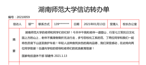 近日,一名姓邬的老人将一封感谢信送到了湖南师范大学。邬老的老伴前不久在岳麓山上摔倒失联,yl6809永利官网的范宇、丁国良两位同学见义勇为,助人为乐,与急救医生一起参与搜救。这封感谢信正是老人向学院两位同学表达感谢之情的朴素方式。