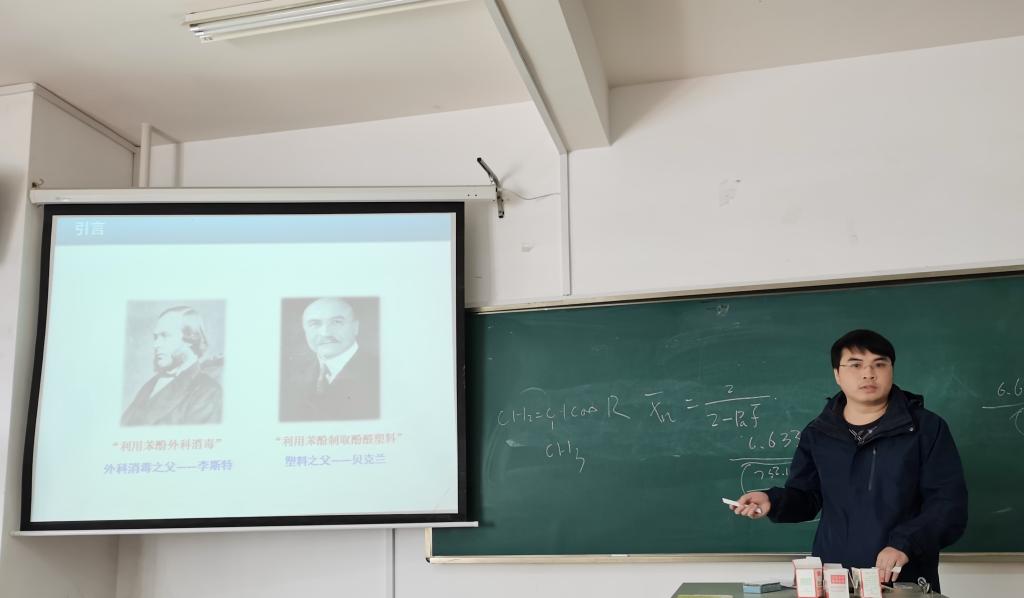 有机化学教研室刘贤响副教授展示了在“醛酮的性质——亚硫酸钠加成”教学中引入自身在柠檬醛催化选择性的创新实例,引导学生关注生物质利用及南方山区的特色精油资源深加工与脱贫帮富,开展思政教育。