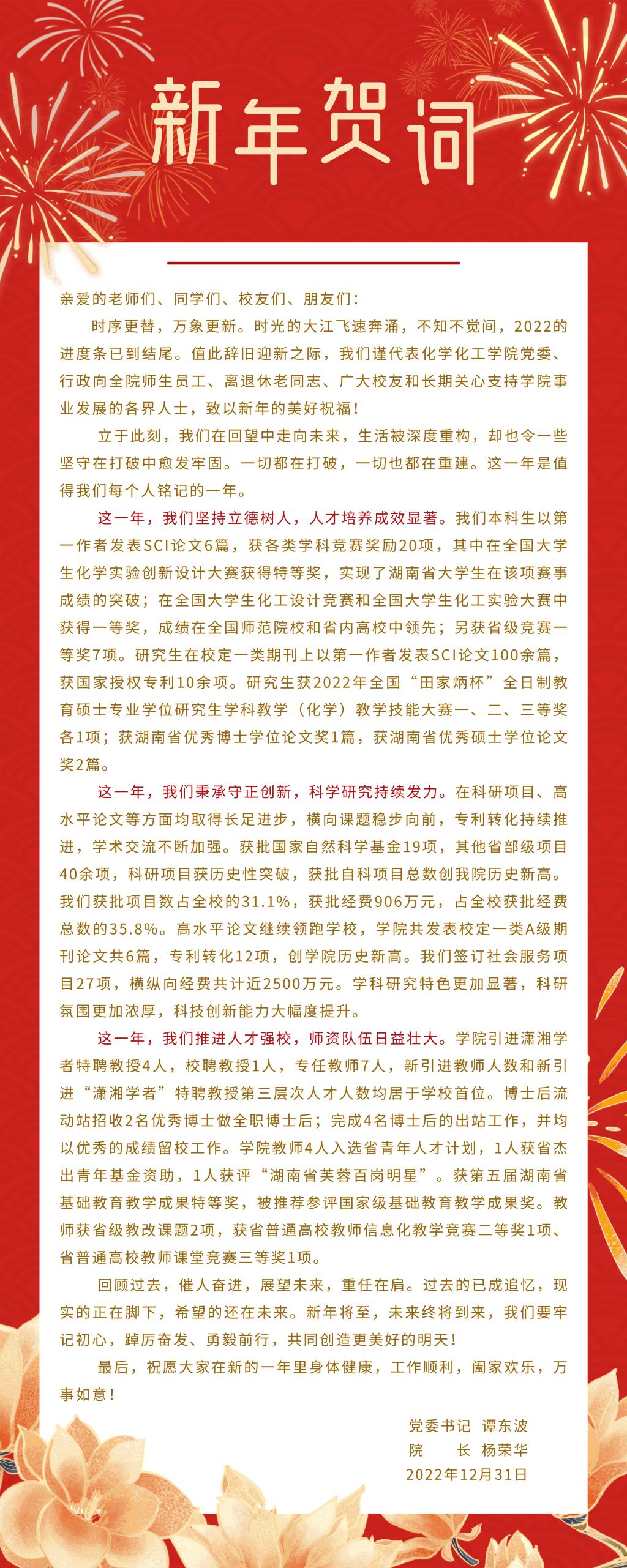 时序更替,万象更新。时光的大江飞速奔涌,不知不觉间,2022的进度条已到结尾。值此辞旧迎新之际,我们谨代表yl6809永利官网党委、行政向全院师生员工、离退休老同志、广大校友和长期关心支持学院事业发展的各界人士,致以新年的美好祝福!