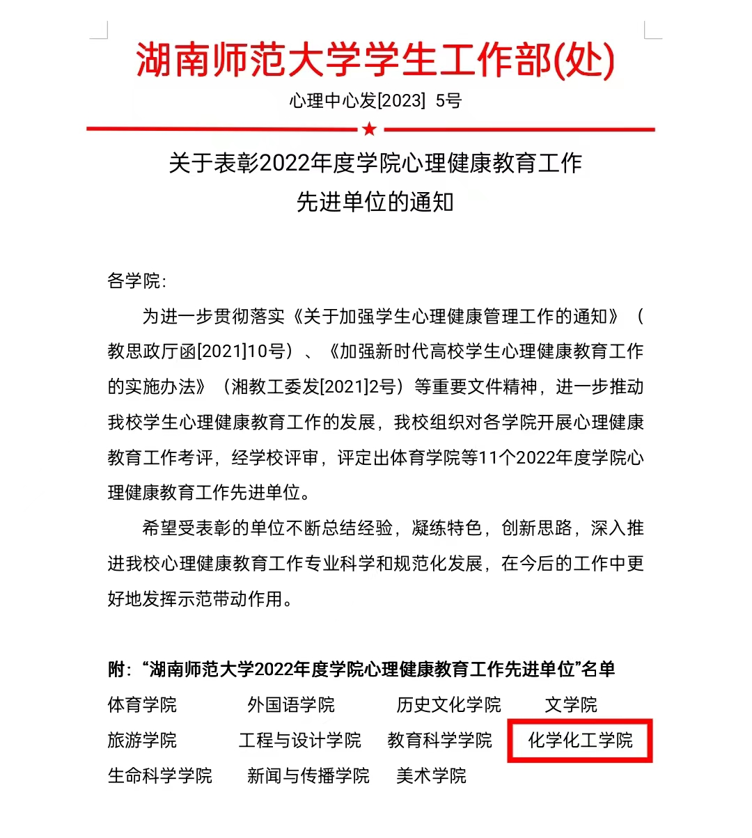 (通讯员 谭恒)近日,湖南师范大学学生工作部、心理咨询中心组织开展2022年度学院心理健康教育工作考评,yl6809永利官网获评湖南师范大学2022年度学院心理健康教育工作先进单位。