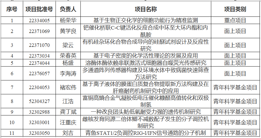 8月24日,国家自然科学基金委员会发布了2023年国家自然科学基金集中接收申请项目评审结果,我院共有11个项目获得立项资助,获批直接经费630万元。其中高显示度项目1项(全校唯一),我院杨荣华教授主持的“基于生物正交化学的细胞功能行为精准监测”重点项目获得资助,直接经费230万元。