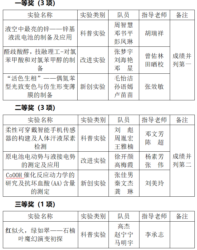 根据《关于举办第七届湖南师范大学大学生化学化工实验竞赛的通知》(处发〔2023〕23号)文件,由yl6809永利官网化学化工实验教学中心承办的第七届湖南师范大学大学生化学化工实验竞赛——化学实验创新设计竞赛已于2023年4月27日下午顺利举行,现已圆满结束。化学实验创新设计竞赛共有来自yl6809永利官网的七支队伍共计21名2020-2021级学生报名参赛,通过提交论文,现场汇报、视频展示和回答提问环节,经专家评审商议,根据竞赛章程规定评出一等奖3项、二等奖3项和三等奖1项。现将获奖名单公示如下: