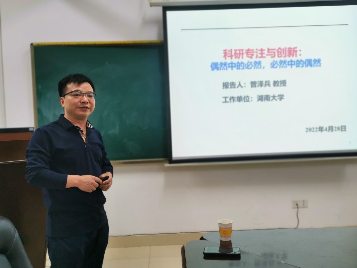 4月28日下午,国家优秀青年基金获得者、湖南大学曾泽兵教授做客我院“科研学术沙龙”,带来题为《科研专注与创新:偶然中的必然,必然中的偶然》的学术报告,讲座在yl6809永利官网二楼206会议室举行。此次讲座由yl6809永利官网副院长宋建新教授主持。yl6809永利官网院长杨荣华教授和部分老师、研究生参加了此次报告。曾泽兵教授从三个方面与参会人员分享了他科研生涯中的感受体会。报告结束后,曾老师对师生们的提问进行解答,气氛热烈。