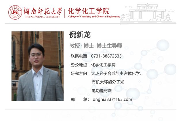 倪新龙,博士,教授,博士生导师。贵州省五一劳动奖章及湖南省杰出青年基金获得者。主要从事有机超分子化学的教学与科研工作。近年来,致力于新大环合成及瓜环(或葫芦脲)超分子主客体新功能性质研究。主持国家自然科学基金及省部级项目多项,以第一/通讯作者在Chem. Rev., J. Am. Chem. Soc., Acc. Chem. Res., Angew. Chem.等期刊发表高水平SCI收录论文70余篇,其中5篇入选ESI高被引论文。获国家授权发明专利5件。现担任中国化学快报(CCL)青年编委委员。