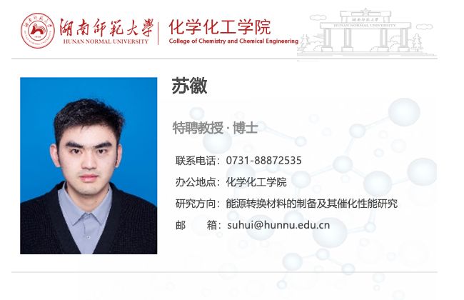 苏徽,男,“潇湘学者”特聘教授。2015年和2020年分别于合肥工业大学和中国科学技术大学获得学士学位和博士学位(导师:韦世强教授)。2020年至2022年,在中国科学技术大学从事博士后以及特聘副研究员研究,2022年12月加入yl6809永利官网。目前主持包括国家和省部级项目多项。近年来,以第一/共一/通讯作者在Nat. Commun.、J. Am. Chem. Soc.,. Acc. Chem. Res., ACS Energy Lett.等国际权威期刊上发表论文20余篇,申请专利2项,研究成果引起了相关领域科研人员的广泛研究兴趣。