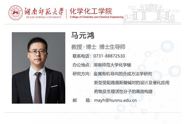 马元鸿,男,教授,“潇湘学者”特聘教授,湖南省高层次计划人才。2008年和2011年分别于西北师范大学获得理学学士和理学硕士学位(导师:李政教授),2014年于四川大学有机化学专业获得理学博士学位(导师:游劲松教授)。2014年9月至2018年1月,在日本国立理化学研究所从事博士后研究(合作导师:侯召民教授)。2018年2月至2019年12月,在德国马克斯-普朗克煤炭研究所开展博士后研究(合作导师:J. Cornella博士)。2020年1月高层次人才引进加入湖南师范大学从事有机化学相关的教学与科研工作。近年来一直致力于金属有机化学、有机合成化学、有机功能材料等方面的前沿研究,主持和参与了包括国家863计划、国家自然科学基金项目在内的诸多科研项目,在所从事的领域取得了一系列开拓性研究进展,截至目前,已经在Chem. Soc. Rev.、J. Am. Chem. Soc.、Angew. Chem. Int. Ed.、ACS Catal.、Org.Lett.、Chem. Commun.、Chem. Eur. J等国际知名化学期刊发表论文20余篇。