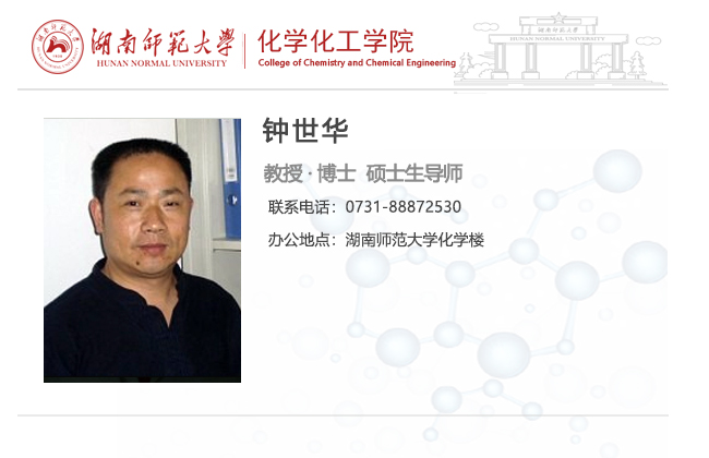 钟世华,男(1965-8),博士,教授。湖南师范大学硕士导师,制药工程系学科带头人。1987年6月毕业于南开大学化学专业有机化学方向,同年进入湖南益阳生物化工有限公司工作,历任技术科长、总工程师、副总经理等职,主持新产品开发9年;2004年4月调入湖南师范大学主持制药工程系工作至今。