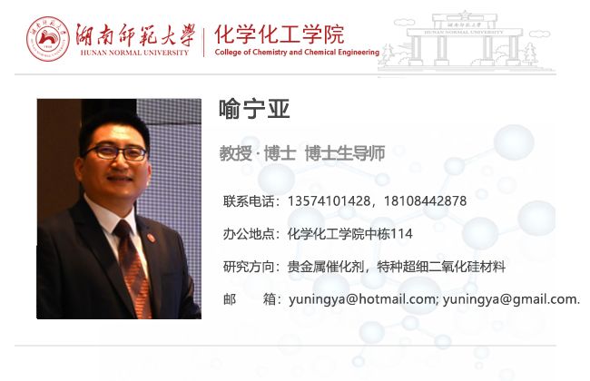 喻宁亚,教授,1978年2月出生,中国科学院山西煤炭化学研究所物理化学专业博士毕业。2008年到2010年在台湾中央研究院从事博士后研究,现任石化新材料与资源精细利用国家地方联合工程实验室副主任,yl6809永利官网教授,中国科学院山西煤炭化学研究所客座研究员。长期从事精细化学品合成中催化剂的研发工作。已主持完成国家自然科学基金课题1项、主持省(部)和中科院及湖南中烟等重要课题5项;已申请发明专利8项,其中授权2项;在J. Catal. (一区,IF=6.073)、Micropor. Mesopor. Mater. (二区,IF=3.209)、Catal. Lett.、催化学报等学术期刊上发表论文50多篇。2008年获湖南省青年化学化工奖。