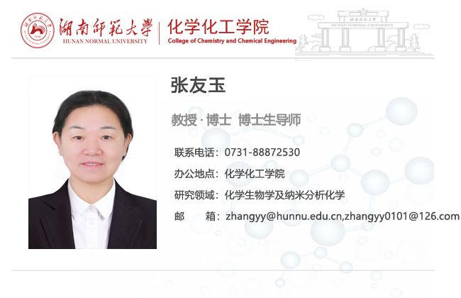 张友玉,博士,二级教授,博士生导师。主要从事化学生物学及纳米分析化学等领域的研究。主持国家自然科学基金面上项目5项,国家基金重点项目协作项目1项,省部级重点及一般项目10余项。以第一作者和通讯作者在Sci. Adv.,Angew. Chem. Int. Ed., Anal. Chem., Chem. Commun.等国际著名刊物上发表高水平研究论文200余篇,获国家授权发明专利7项。获湖南省自然科学奖二等奖1项,湖南省科学技术进步奖二等奖1项,中国分析测试学会科学技术奖(CAIA奖)二等奖1项。获2018年湖南师范大学芙蓉百岗明星称号。