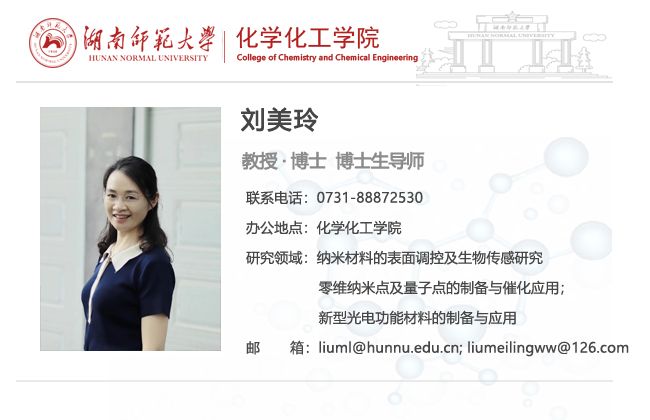 刘美玲,理学博士,教授,博士生导师,湖南省芙蓉学者青年学者,湖南省青年骨干教师培养对象。2006年硕士毕业留校工作,2012年获得理学博士学位。2017年6月-2018年6月在加州大学洛杉矶分校访学。主要从事光、电分析化学与传感和纳米材料的表界面调控与应用等领域的研究工作,在功能化有机化合物的合成、表征和应用,压电光谱电化学,碳基纳米材料功能化与应用等领域完成了一些创新研究工作。曾获湖南省优秀博士论文和湖南省优秀硕士论文奖,湖南省自然科学奖二等奖等奖项。主持和完成4项国家自然科学基金、多项湖南省科技厅、教育厅及企业合作课题。在Adv. Mater., Anal. Chem., Chem. Commun., J. Mater. Chem. A, ACS sensors, ACS Appl. Mater. Interfaces, Biosens. Bioelectron., J. Agri. Food Chem.等国内外刊物发表论文100余篇,被Chem. Rev等SCI期刊他引3000多次,多篇论文进入高被引行列。已指导多名本科生以第一作者在分析化学相关领域发表SCI论文8篇,在本科生创新培养方面形成了特色。