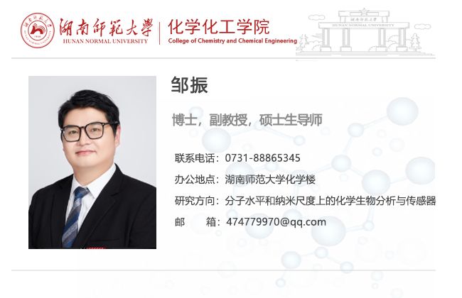 2022年9月起加入yl6809永利官网国家杰青、教育部长江学者杨荣华教授团队从事科研教学工作。主要从事分子水平和纳米尺度上的化学生物分析与传感器研究。聚焦于核酸荧光传感与分子识别的关键科学问题,系统开展基于核酸的生化传感新原理与新方法的基础应用研究,构建疾病标志物分析、药物分析、环境污染检测、食品安全分析的新方法。目前主持承担国家自然科学基金青年项目、湖南省自然科学基金优秀青年项目、湖南省教育厅优秀青年项目、长沙市自然科学基金等多项研究课题。已在Angewandte Chemie、Biomaterials、Trends in Analytical Chemistry、Analytical Chemistry等国际权威期刊发表论文30余篇,申请发明专利8项,参编专著1部。湖南省研究生创新项目指导老师(3项)。与中南大学湘雅医院、湖南省肿瘤医院、湖南省人民医院等保持良好合作关系,针对临床问题展开科学研究,努力在分子诊断、疾病治疗等相关领域推进成果转化,产生效益。