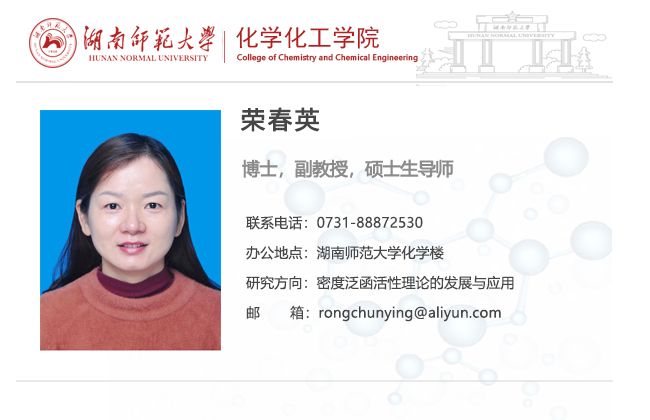 荣春英,博士,副教授,硕士生导师,毕业于湖南师范大学理论计算化学专业。主持完成国家自然科学基金青年项目1项,湖南省青年基金1项,湖南省面上项目1项,教育厅项目1项。以第一作者和通讯作者在WIREs Comput.Mol.Sci., J. Phys. Chem. Lett., Phys.Chem.Chem.Phys.,等国际著名刊物上共发表高水平论文42篇,获授权专利2项。