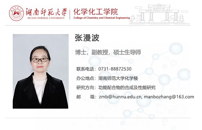 张漫波,博士,硕士生导师。长期从事功能配合物的合成及性能研究。在设计合成具有特定结构和光响应性能的功能配合物方面积累了丰富的经验,并对功能配合物的构效关系有较深刻的认识。已在国内外专业刊物上正式发表学术论文50余篇,包括Angew. Chem. Int. Ed.(被引413次),Materials Today Physics,Crystengcomm等。2006-至今在湖南师范大学从事教学科研工作。主持过国家自然科学基金面上项目(20871046),湖南省教育厅基金(06C514、11B077),湖南师范大学青年优秀人才培养计划基金(ET20903)和湖南师范大学博士启动基金。现主持湖南省教育厅基金一项(17C0948),湖南师范大学化学生物学及中药分析教育部重点实验室人才基金(KLCBTCMR201808)。2016年,“氧基簇合物的设计、合成及性能”获得国家自然科学二等奖(排名第四)。