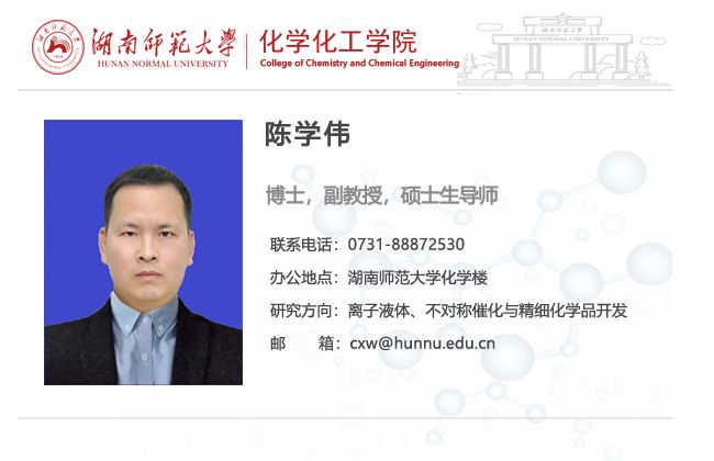 2008年获工学博士学位(湖南大学),2011年博士后流动站出站(华南理工大学)。目前在湖南师范大学精细催化合成研究所,主要从事离子液体、不对称催化与精细化学品开发等方面的研究工作。发表第一作者SCI论文5篇,被引用一百余次。