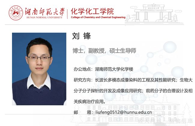 刘锋,男,博士,副研究员(校聘副教授),硕士生导师。2010年7月获江西师范大学化学(师范类)学士学位,2014年6月获湖南大学化学工程硕士学位(导师:俞汝勤教授),2020年7月获湖南大学分析化学博士学位(导师:俞汝勤教授);同年8月加入湖南大学yl6809永利官网化学工程与技术博士后流动站进行博士后研究工作(合作导师:蒋健晖教授)。主要从事有机小分子成像探针设计合成及在重大疾病如癌症及心脑血管疾病的活体成像分析及靶向药物传输方面的研究。目前以第一作者/共同一作在Angewandte Chemie International Editioin、Chemical Science、Analytical Chemistry、Analyst、RSC Advances等国际知名学术期刊上发表论文5篇,申请中国发明专利3项,其中2项已授权;主持国家自然科学基金青年项目1项和中国博士后面上基金项目二等资助1项,作为核心骨干参与国家自然科学基金重大研究项目1项。