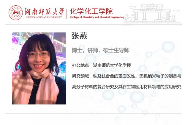 张燕,女,博士,硕士生导师。长期从事钛及钛合金的表面改性、无机纳米粒子的制备与高分子材料的复合研究及其在生物医用材料领域的应用研究。已在国内外期刊发表多篇论文及专利。主持两项校企合作项目,参与国家自然科学基金、湖南省自然科学基金、长沙市科学技术局等多项项目。获得湖南师范大学2022年青年教师课堂教学竞赛二等奖。